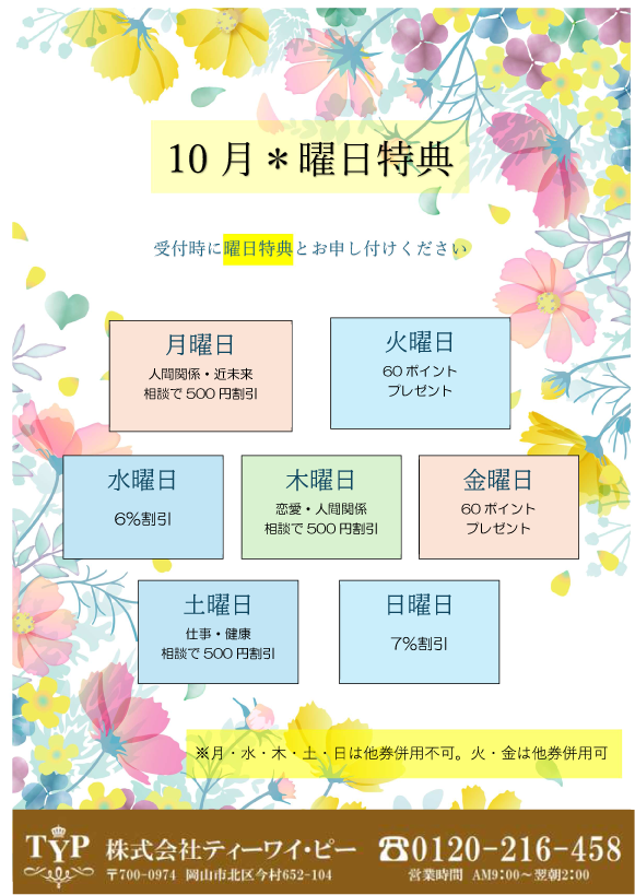 ご希望の方は受付時に「曜日特典」とお申し付けください。