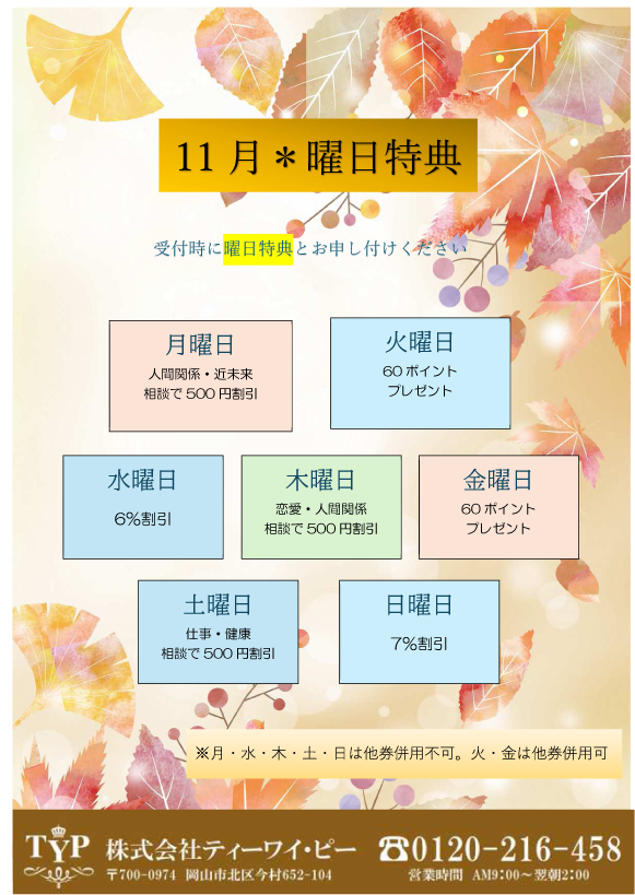 11月★曜日特典 期間2025/11/01~2025/11/30 曜日特典 ★11月の曜日特典★ 日替わりの毎日がお得な曜日特典です♪ 内容がこちら! ↓↓↓ 月曜日 人間関係・近未来相談で500円割引 火曜日 60ポイントプレゼント 水曜日 6%割引 木曜日 恋愛・人間関係相談で500円割引 金曜日 60ポイントプレゼント 土曜日 仕事・健康相談で500円割引 日曜日 7%割引 ご希望の方は受付時に「曜日特典」とお申し付けください。 ※鑑定後の適用はできません。 ※自動的に適用されるものではありません。 -